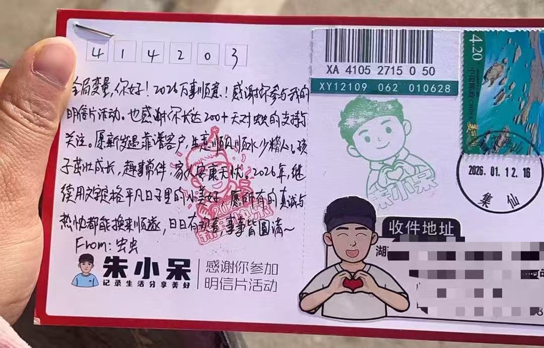收到虫虫的明信片 日志 · 2026-01-22 前些天收到了来自 @虫虫的明信片,是一封定制版的明信片,有心了,非常喜欢!字里行间都是满满的心意和祝福,特别温暖。在这里也回赠虫虫最真诚的祝愿:愿你接下来的每一天都平安喜乐、健康顺遂,工作顺心、生活舒心,梦想步步成真,所有美好都如约而至,万事皆胜意!年底了,生意会比平时要忙很多,所以会暂时不会参与到各位的互动,见谅,哈哈。 版权属于: 全局变量 本文链接: 作品采用: 《 署名-非商业性使用-相同方式共享 4.0 国际 (CC BY-NC-SA 4.0) 》许可协议授权 上一篇:说说 下一篇:没有了