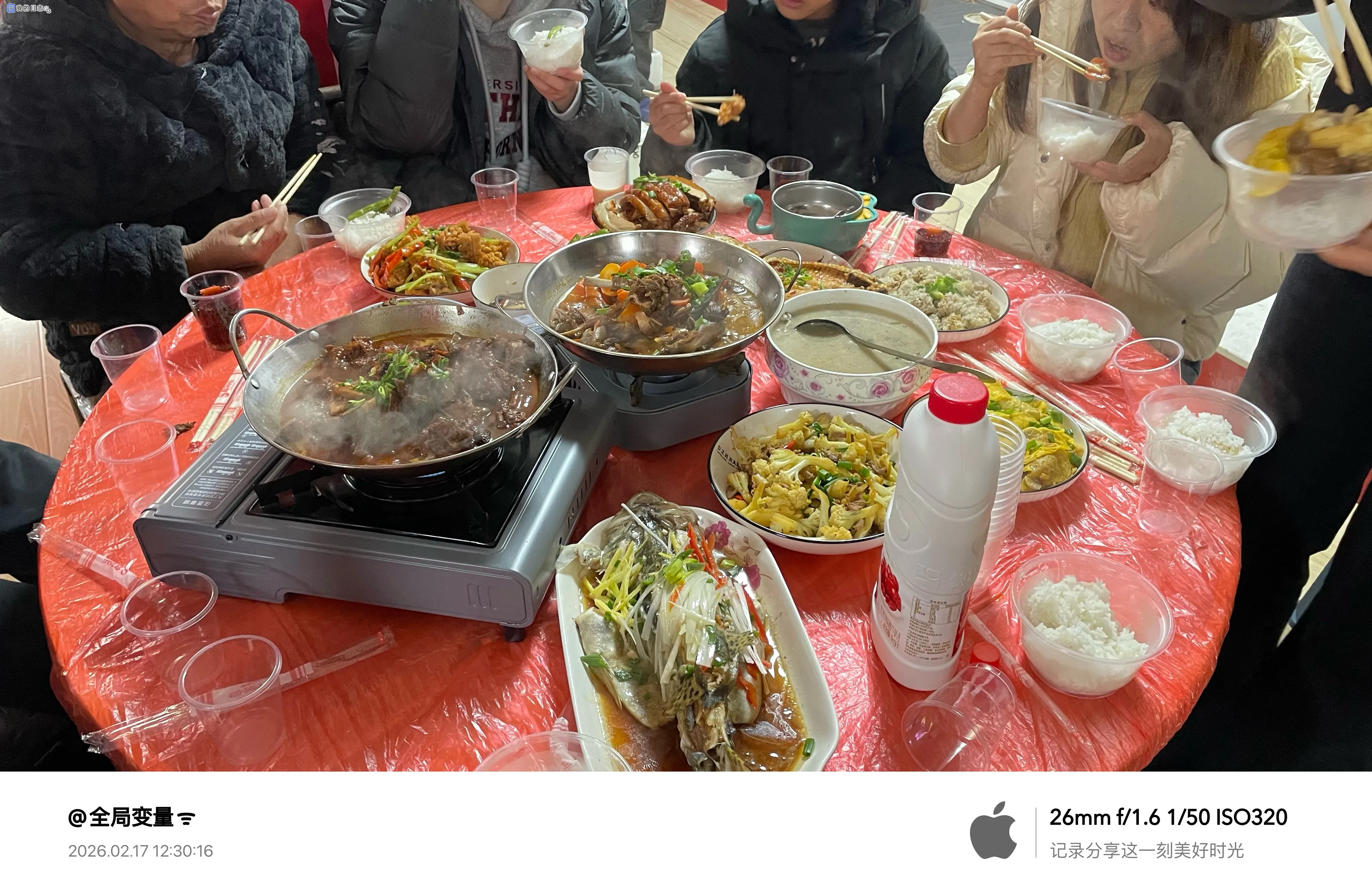 团年饭桌上,大家都拿着手机拍个不停,我也拍了些照片发朋友圈,这似乎已成了如今的常态。我们家的团年饭固定在大年三十上午十点,每年都是如此:当天早饭不吃,等到十点放完鞭炮就开吃,午饭也一并省了,直到晚上六点才再吃晚饭。所以每年过年,上午十点是最重要的时间节点,要是没能赶在这个时间点回家,就相当于没在家过这个年。至于为什么是十点,网上有不少说法,说是当年先辈们要在十点吃完团聚饭后归队,不同地方的时间也不同,有的是除夕前一晚,有的是除夕当天,我们这里便一直延续着上午吃团年饭的习俗,这么多年从未变过。